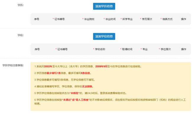 2.学历信息最少填写1条信息,最多可填写5条信息。