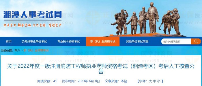 根据人力资源和社会保障部人事考试中心《关于印发〈专业技术人员职业资格考试报名证明事项告知承诺制工作规程〉的通知》(人考中心函〔2021〕1号)、省人力资源社会保障厅《关于专业技术人员资格考试实行考后资格审查的通知》(湘人社函〔2012〕526号)、《关于做好湖南省2022年度一级注册消防工程师资格考试考务工作的通知》(湘人社考函〔2022〕23号)、《关于做好湖南省2022年度执业药师职业资格考试考务工作的通知》(湘人社考函〔2022〕22号)有关考务文件精神,现将做好2022年度一级注册消防工程师、执业药师资格考试(湘潭考区)考后人工核查工作有关事项公告如下: