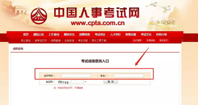 步骤2:进入考试成绩查询入口,填写【证件号码】、【姓名】及【验证码】