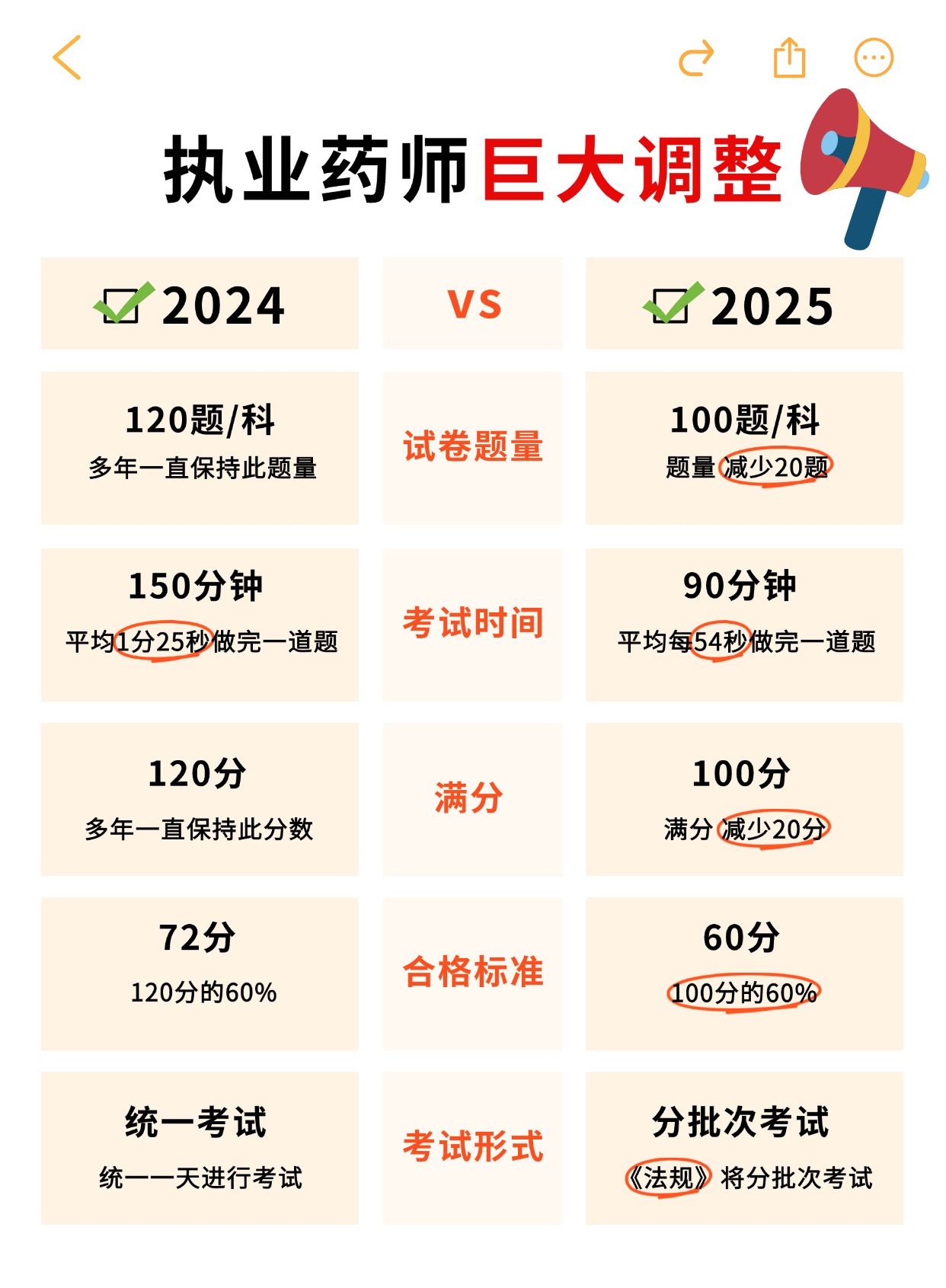 一、从2025年起,执业药师职业资格考试每科试卷题量调整为100题,满分为100分,考试时间为90分钟。致电官方,分数线由72分调整为60分,考生可放心备考!
