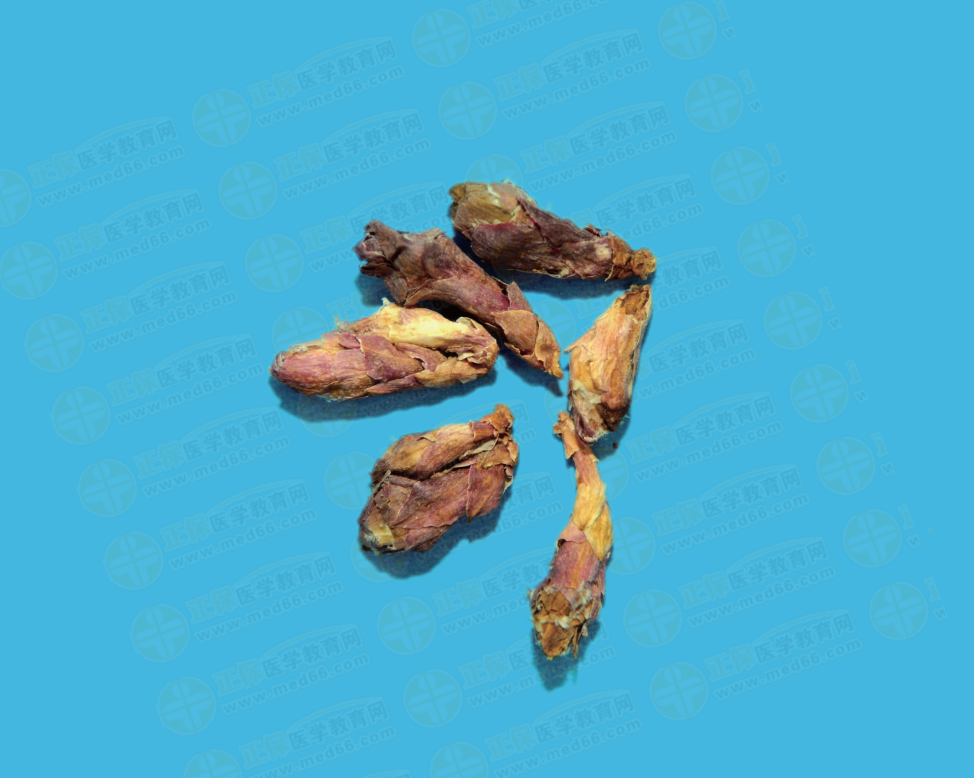 药材呈长圆棒状,常单生或2~3个基部连生。上端较粗,下端渐细或带有短梗,外面被有多数鱼鳞状苞片,习称“连三朵”。苞片外表面紫红色或淡红色,内表面密被白色絮状茸毛。体轻,撕开后可见白色茸毛。气清香,味微苦而辛。