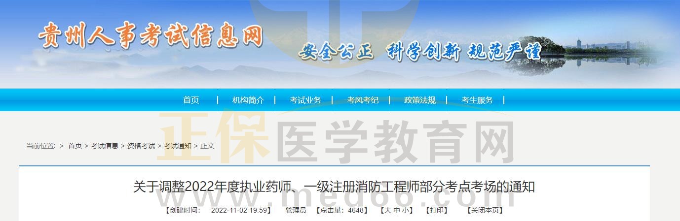 贵州人事考试信息网发布了《关于调整2022年度执业药师、一级注册消防工程师部分考点考场的通知》,具体通知内容如下: