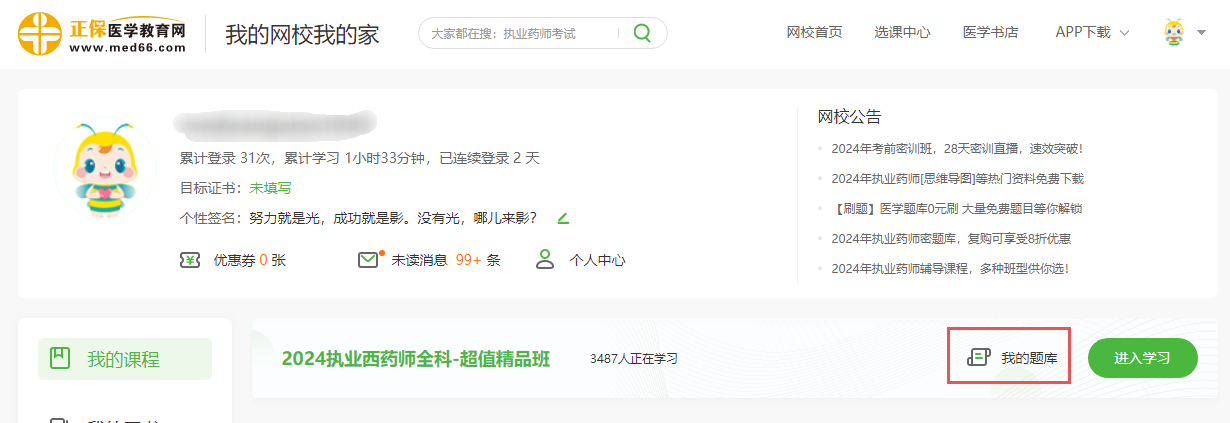 1、登录学员账号,进入我的网校我的家,选择“我的题库”