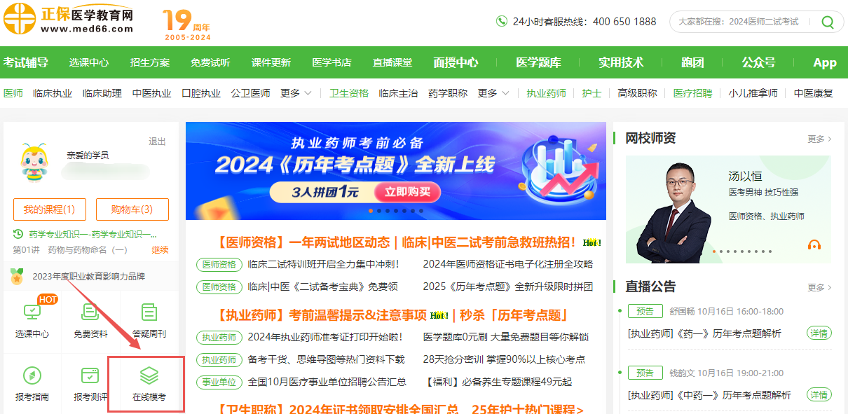 1、医学教育网首页,点击“在线模考”