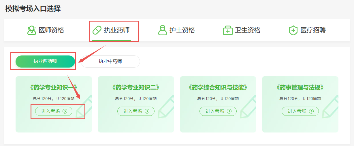2、进入在线模考界面,选择“执业药师”-“执业西药师”或者“执业中药师”-选择任意试卷,点击“进入考场”即可。