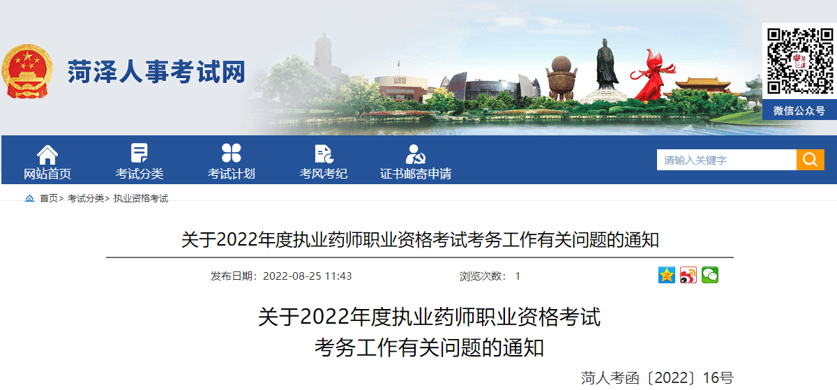 山东菏泽2022年度执业药师职业资格考试公告