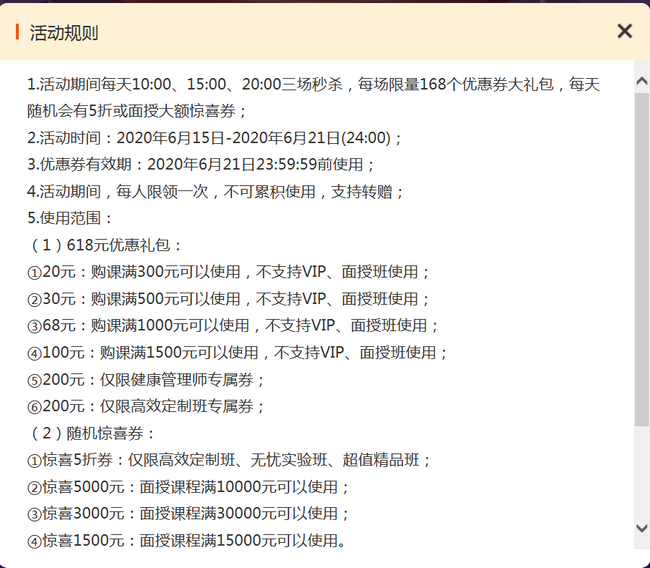 执业药师考生福利来袭 0元秒杀618元优惠券 可与活动价同享! 2020年6月15日-2020年6月21日(24:00)每天10:00、15:00、20:00三场秒杀,每场限量168个优惠券大礼包,每天随机会有5折或面授大额惊喜券: