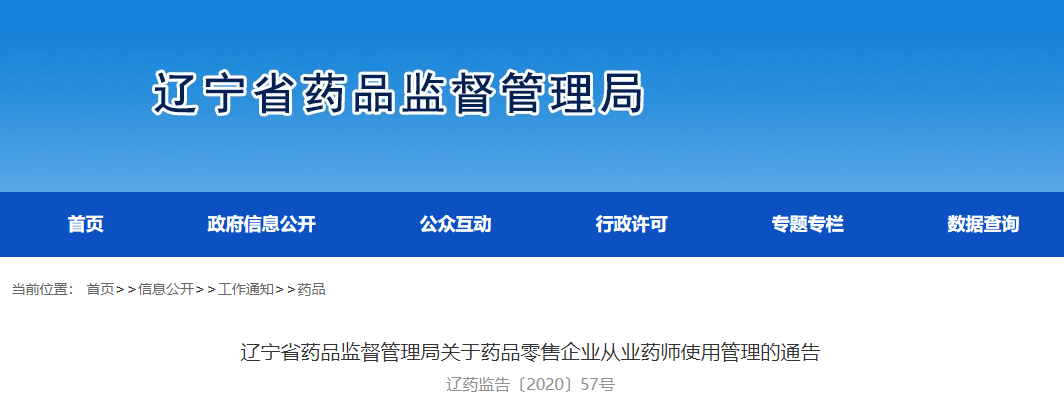 辽宁省药品监督管理局发布了《辽宁省药品监督管理局关于药品零售企业从业药师使用管理的通告》。