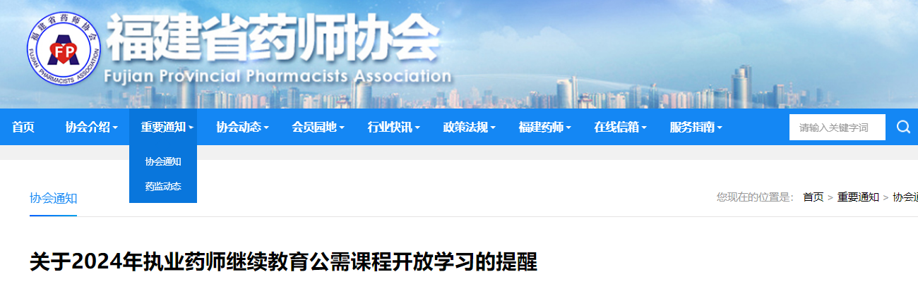 2024年福建省执业药师继续教育报名已于2024年2月18日开始,报名后网授的专业课程可以马上开始学习。2024年配套的公需课程待福建省人力资源保障厅的最新文件通知后开放学习,已报名学员无须再缴费。届时协会将在网站和公众号上通知,大家敬请耐心等待。