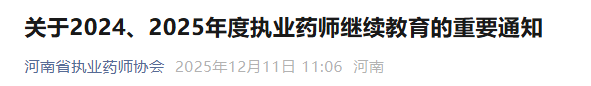 根据《执业药师继续教育暂行规定》及上级部门要求,执业药师应在当年度参加继续教育并取得学时,原则上不得结转或者顺延至以后年度。2025年度(含补学2024年度)执业药师继续教育将于2025年12月31日截止,请还未完成执业药师继续教育的学员在河南药师网(www.hnysw.org)或“河南省执业药师协会”微信公众号完成及时学习并获取学时卡,过期将不再受理。
