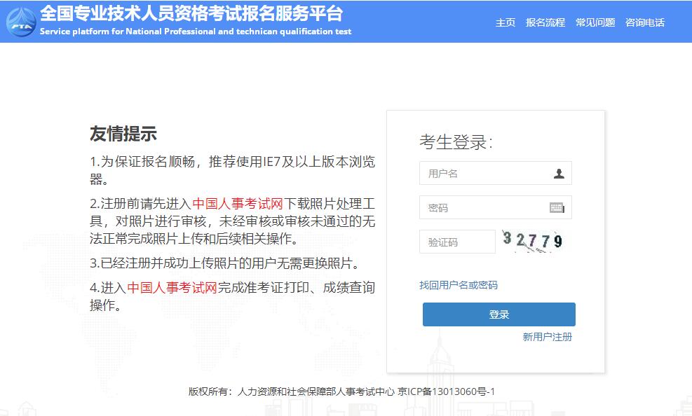 为提高服务水平,为注册用户提供更多的个性化服务,报考人员在进行网上报名之前,需要注册用户信息。注册成功后方可进行报名操作。 注册信息即用户基本信息:用户名、密码、真实姓名、证件类型(身份证、军官证、护照等)、证件号码、照片、邮箱、电话。 考生访问中国人事考试网http://www.cpta.com.cn/,点击【网上报名】进入考生登入页面。如图: