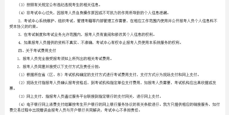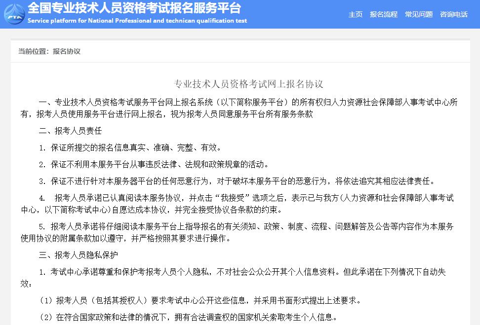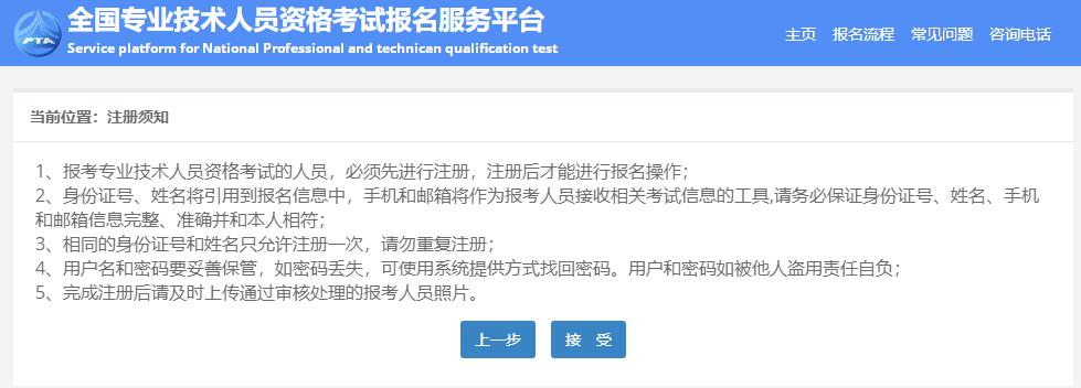 阅读专业技术人员资格考试网上报名协议,并点击【接受】按钮,此时进入注册须知页面,如图1-4。