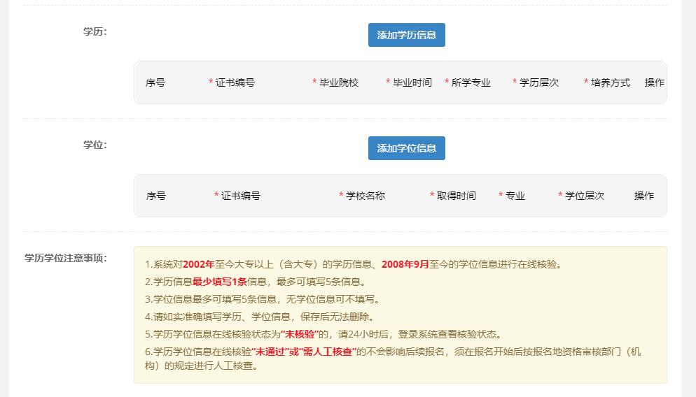 在页面中根据需要,添加学历或学位信息,添加完成后,点击【保存】按钮,完成学历学位的修改。