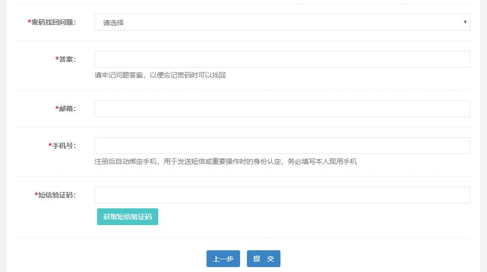 进入修改注册信息界面,可修改密码找回问题以及修改手机号和学历信息,如图: