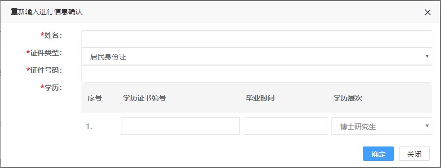 填写完毕确认无误后点击【提交】,出现信息确认,需要考生重新输入姓名、证件类型、证件类别、证件号码、学历、学位信息进行二次确认。如下图所示: