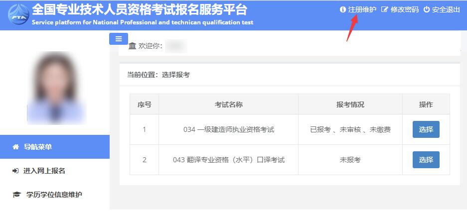 进入登陆界面后,用户若需修改注册信息,点击【注册维护】,如图: