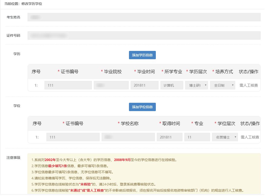 点击【修改学历】按钮,进入修改学历学位页面,如图: