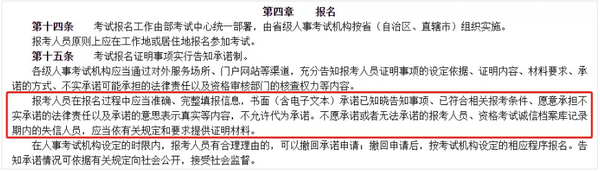 人社厅发〔2021〕18号:报考人员在报名过程中应当准确、完整填报信息,书面(含电子文本)承诺已知晓告知事项、已符合相关报考条件、愿意承担不实承诺的法律责任以及承诺的意思表示真实等内容,不允许代为承诺。不愿承诺或者无法承诺的报考人员、资格考试诚信档案库记录期内的失信人员,应当依有关规定和要求提供证明材料。
