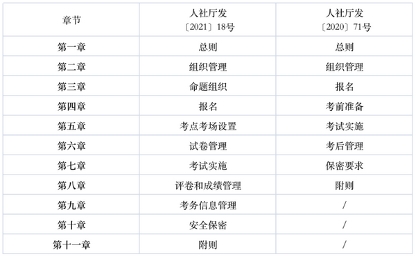 跟11年前的〔2000〕71号版本相比,本次发布的《专业技术人员职业资格考试考务工作规程》增加了3章内容,共11章。