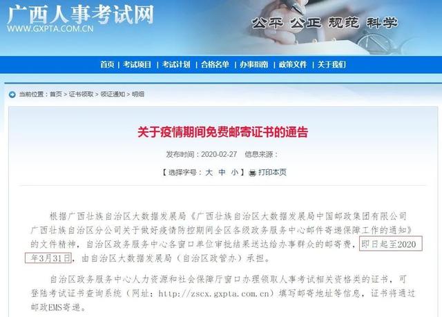 按照《人力资源和社会保障部人事考试中心〈疫情防控期间有关事项的通告〉》、《云南省发布重大突发公共卫生事件一级响应20条措施》、《云南省人民政府办公厅关于切实加强新型冠状病毒感染的肺炎疫情防控工作的通知》(云政办发〔2020〕5号)要求,通过2019年度执业药师职业资格考试合格人员资格审查的考生,请于2020年3月2日-31日24:00前,登录云南人力资源和社会保障网人事考试专栏(http://hrss.yn.gov.cn/ynrsksw)左侧“网上考务”栏目中的“证书办理”按钮,选择本人证书邮寄(证书邮寄申请详细流程请参照云南人力资源和社会保障网人事考试专栏“证书邮寄操作指南”操作)。