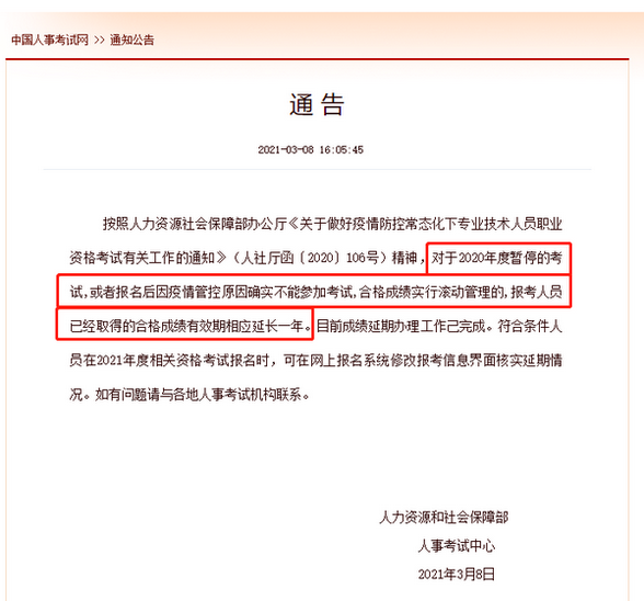 按照人力资源社会保障部办公厅《关于做好疫情防控常态化下专业技术人员职业资格考试有关工作的通知》(人社厅函﹝2020﹞106号)精神,对于2020年度暂停的考试,或者报名后因疫情管控原因确实不能参加考试,合格成绩实行滚动管理的,报考人员已经取得的合格成绩有效期相应延长一年。目前成绩延期办理工作己完成。符合条件人员在2021年度相关资格考试报名时,可在网上报名系统修改报考信息界面核实延期情况。如有问题请与各地人事考试机构联系。