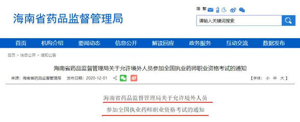 去年12月1日,海南省药品监督管理局发布了《海南省药品监督管理局关于允许境外人员参加全国执业药师职业资格考试的通知》。