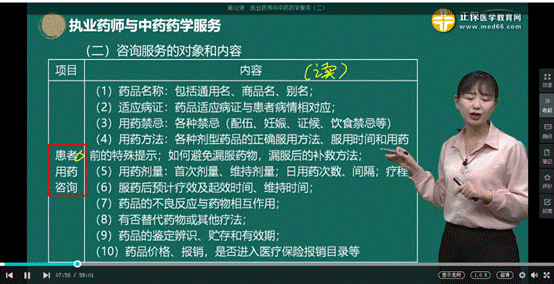 (4)用药方法 包括口服药品的正确服用方法、服用时间和用药前的特殊提示;栓剂、滴眼剂、气雾剂等外用剂型的正确使用方法;缓释制剂、控释制剂、肠溶制剂等特殊剂型的用法;如何避免漏服药物,以及漏服后的补救方法。