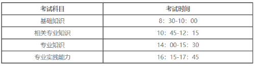 中西医结合内科主治医师资格考试科目分为:“基础知识”、“相关专业知识”、“专业知识”、“专业实践能力”4个科目。各科目考试时间安排为: