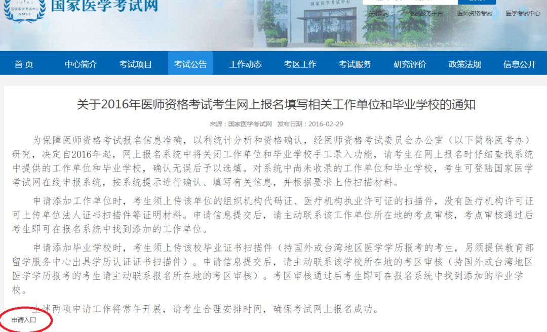 中西医执业医师考试报名入口没有自己所在的单位如何增补?相信很多医师资格考生都在关注,考生应在报名时如实填写工作单位,如报名时找不到自己的试用机构,不可使用名称相似的机构名称报名,应先通过申报系统提交医疗机构的材料申请增补。医学教育网编辑为大家整理了具体的申请图文教程如下: