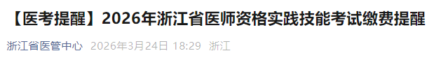 浙江省2026年中西医执业医师实践技能缴费变更为4月1日开始!请相关考生以官方最新通知时间为准,按时完成技能缴费!