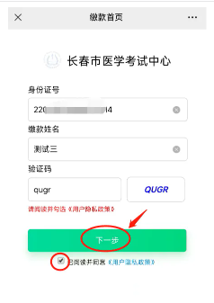2、输入身份证号、姓名、验证码,勾选下方《用户隐私政策》,点击“下一步”。如下图。(他人代缴,请输入参加考试的考生本人信息)