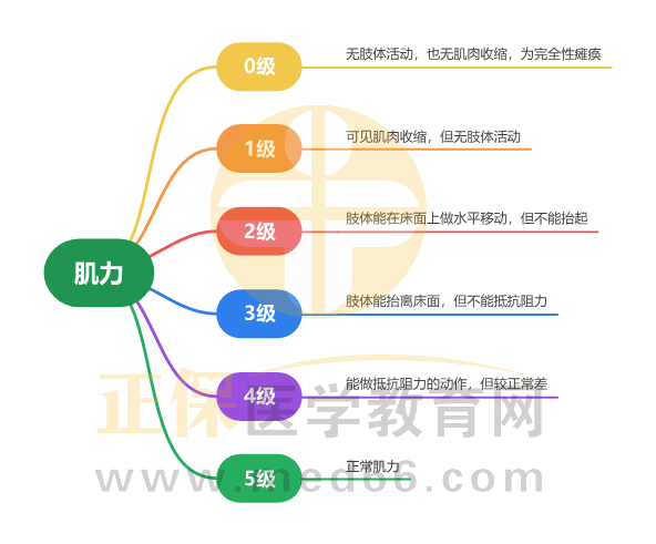 2024年中西医执业医师考试中,诊断学基础考察的都是表浅知识。常考心电图和影像学检查。其它的实验室检查和症状学也是侧重点,一定要掌握具体的指标是针对于哪个疾病有意义。西医的诊断内容出题并不难,但是要求我们基础知识要扎实。医学教育网小编为大家整理“肌力”考点思维导图供大家复习: