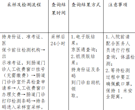 持身份证、准考证、医保卡前往检测机构→出示准考证,到肠道门诊人工收费窗口挂号(无需缴费)→肠道门诊诊室开具检查申请单→人工收费窗口办理欠费→肠道门诊打印检测条码→持条码进入采样室采样。