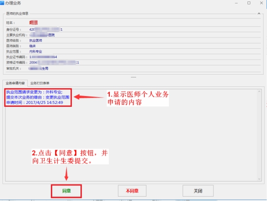 l 及时确认医师的业务申请,并打印相关申请表。如:注册申请、变更申请、重新注册申请及备案注销申请表。