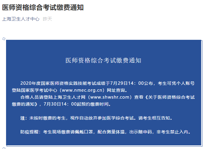 合格人员请登陆上海卫生人才网(www.shwshr.com)查看《关于医师资格综合考试缴费的通知》,7月30日14:00起预约缴费时间。