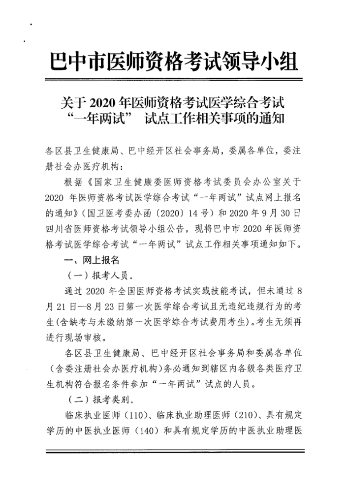 四川巴中市2020年医师资格考试医学综合考试“一年两试”试点工作相关事项的通知,医学教育网编辑分享具体内容如下: