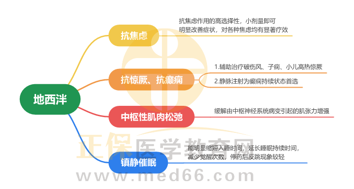 2024年中西医助理医师考试中,药理学出题侧重点在药物作用的基本规律,各类药物的作用机制和临床应用。学习的时候需要掌握一定的学习方法,死记硬背对此学科来说非常困难。医学教育网小编为大家整理“地西泮”考点思维导图供大家复习: