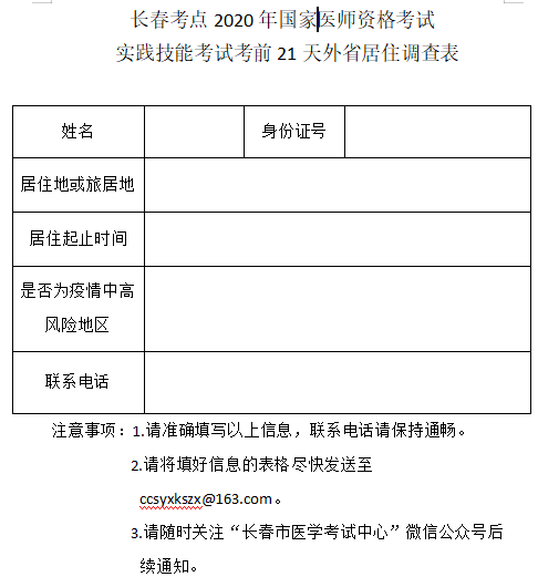 为有效应对当前疫情的风险挑战,保障广大考生和考试工作人员的生命安全和身体健康,保障长春考点2020年医师资格考试实践技能考试安全有序进行,按照长春考点疫情防控方案要求,请参加长春考点2020年国家医师资格考试实践技能考试、且考前21天有外省旅居史的考生下载并填写《实践技能考试考前21天外省居住调查表》(见附件),具体要求如下: