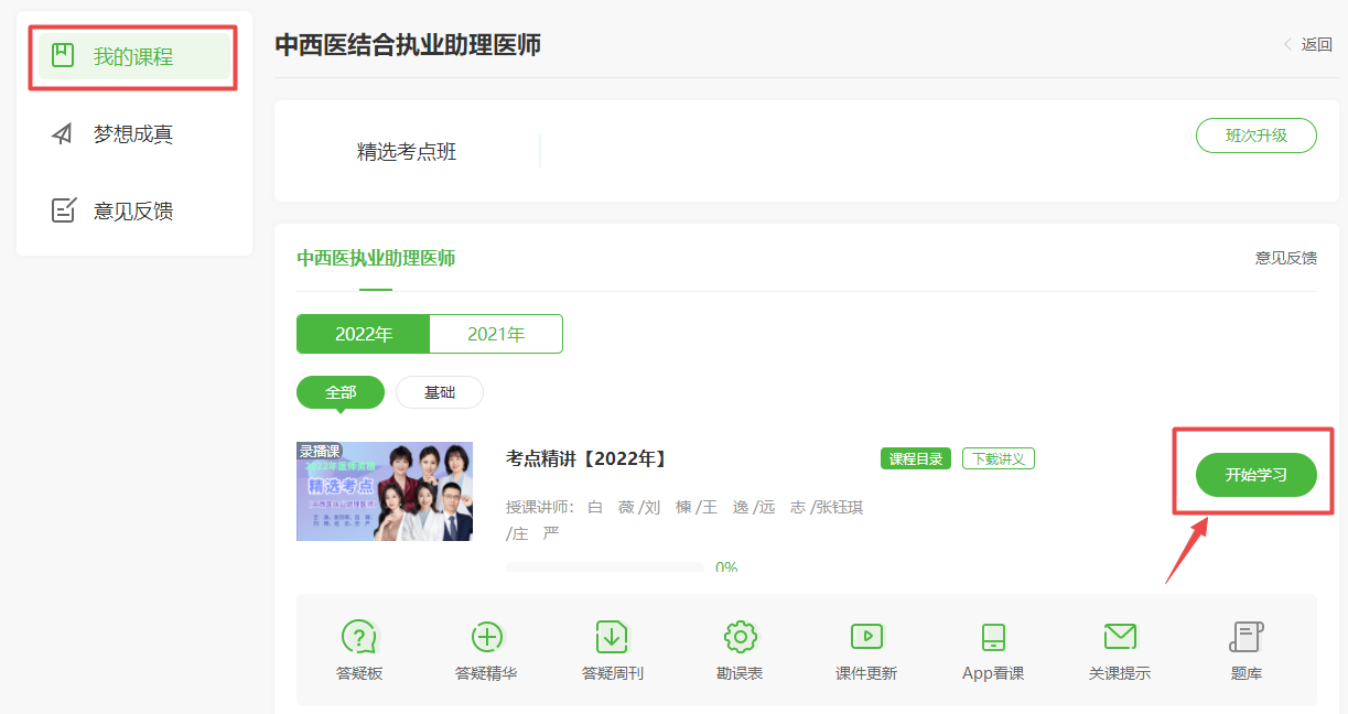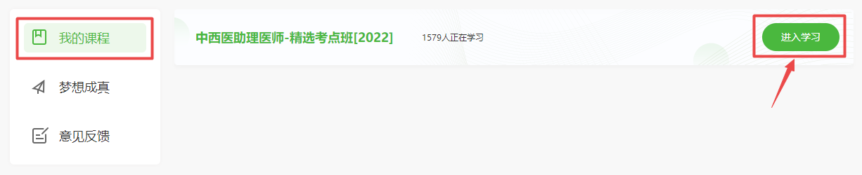 喊你学习啦!2022年中西医执业助理医师“精选考点班”新课更新!快来解锁2022年新课程!已购课同学可以直接进入我的网校我的家-我的课程-精选考点班进入学习!未购课学员点击此处进入选择(点此进入购课>),具体看课位置如下: