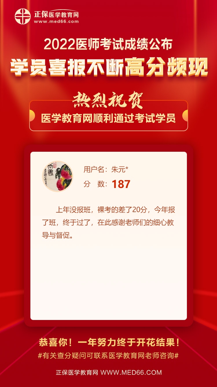 “上年没报班,裸考的差了20分,今年报了班,终于过了,在此感谢老师们的细心教导与督促。”