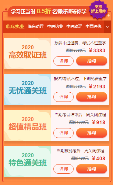 2019年中西医结合执业助理医师成绩公布,也就是说2019年中西医结合执业助理医师考试告一段落,2020年中西医执业助理医师考试备考正式开启!同样,医学教育网为大家送来2020年中西医执业助理医师的优惠课程,请查收!