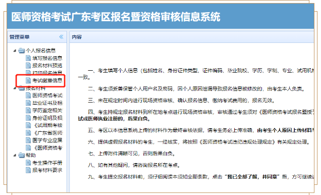 一、考生登录“医师资格考试广东考区报名暨资格审核信息系统”,点击“考试缴费信息”查看需缴费信息。