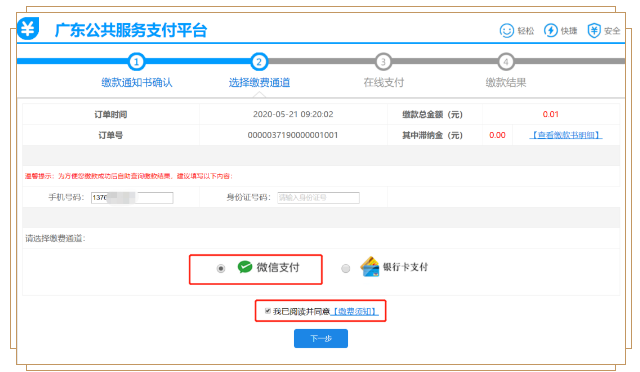 三、选择缴费通道,查看缴费须知,选择“我已阅读并同意缴费须知”,点击“下一步”。