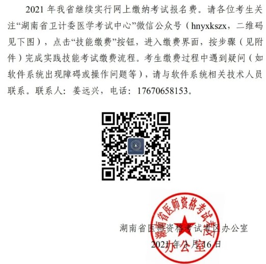 2021年医师资格考试实践技能考试湖南考区考生缴费通知
