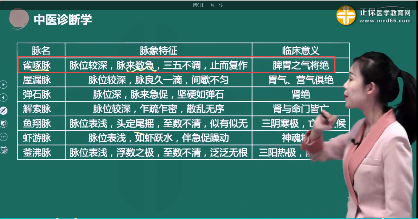 雀啄脉:脉位较深,脉来数急,三五不调,止而复作。临床意义:脾胃之气将绝。