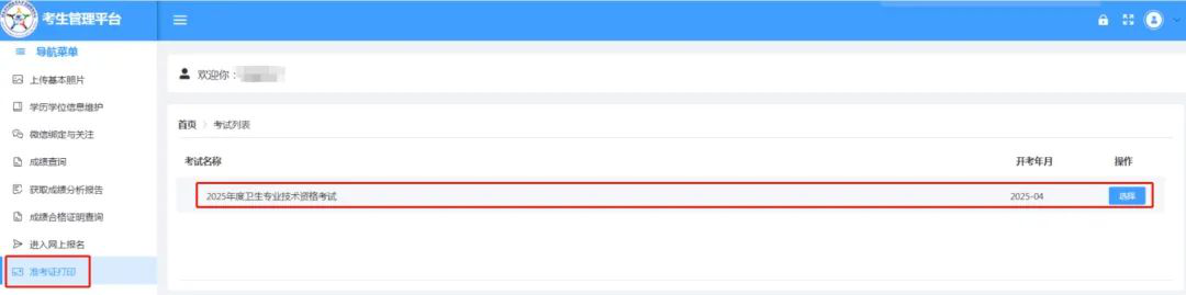登录考生管理平台后,点击左侧导航栏“准考证打印”,在考试列表中选择考试项目。