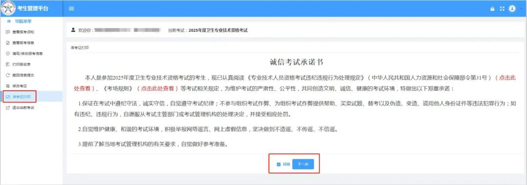 在左侧导航栏选择“准考证打印”,认真阅读《诚信考试承诺书》后勾选“同意”,点击“下一步”。