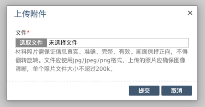 材料照片需保证信息真实、准确、完整、有效。画面保持正向,不得翻转旋转。文件应使用jpg/jpeg/png格式,上传的照片应确保图像清晰,单个照片文件大小不超过200k。