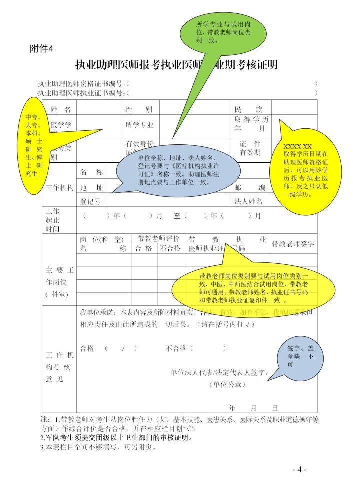 注:1.带教老师对考生从岗位胜任力(如:基本技能、医患关系、医际关系及职业道德操守等方面)作综合评价是否合格,并在相应栏目划“√”。