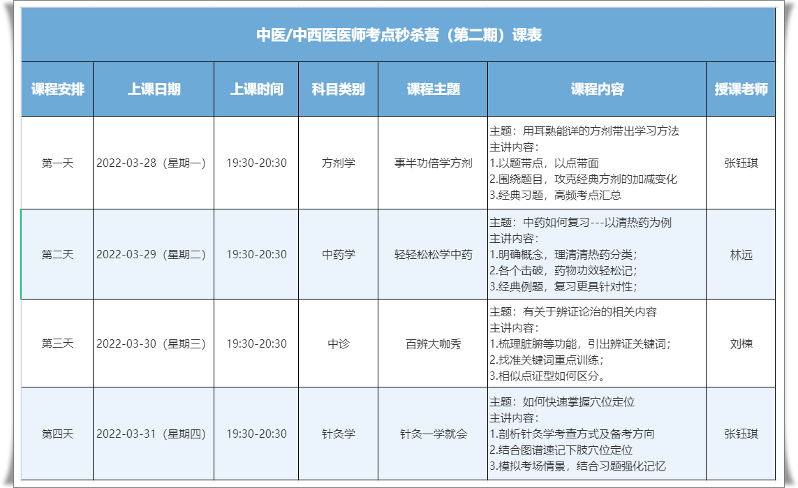 Day1-Day4网校资深讲师张钰琪、刘楝、林远将带领大家拿下方剂学、中药学、中医诊断学、针灸学四大科目历年高频考点,拒绝死记硬背,串联考点体系,捞分有招!